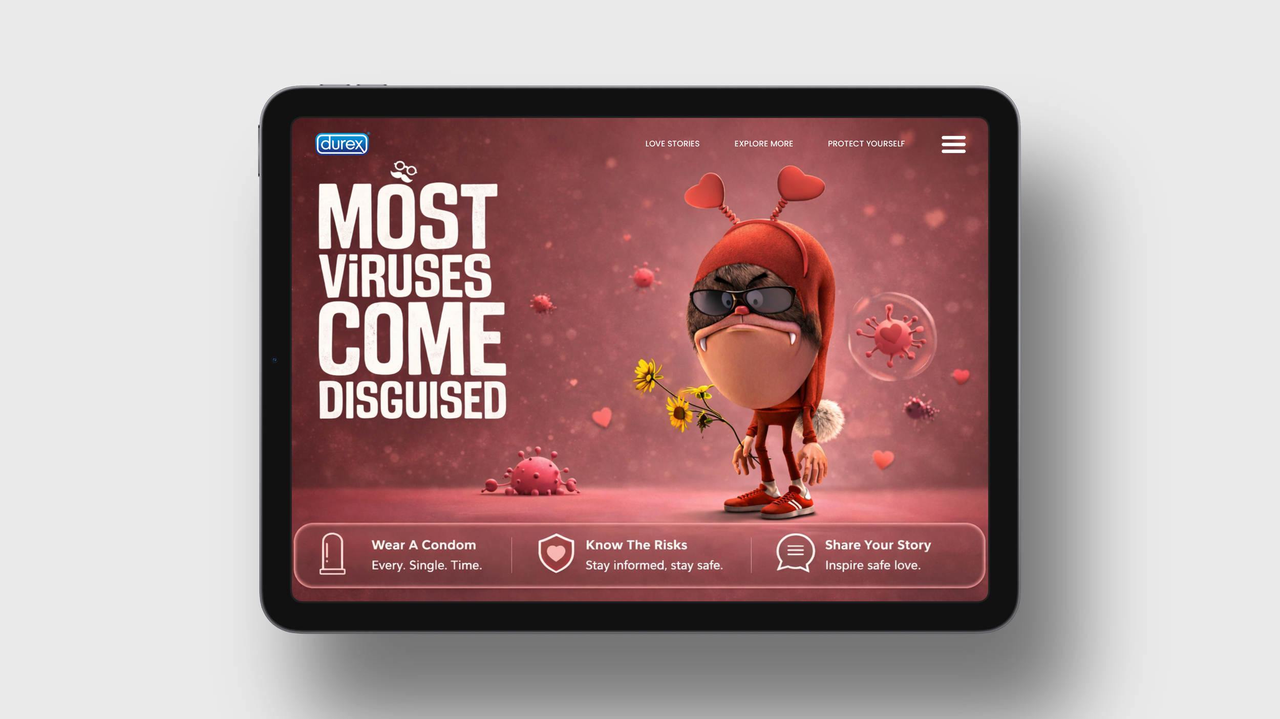 Playfully personifying viruses as charming dates, blushing brides, and unsuspecting professionals, the visuals used humor and stylized 3D characters to deliver a serious reminder: protection isn’t optional. I used Photoshop and Procreate to create the characters.